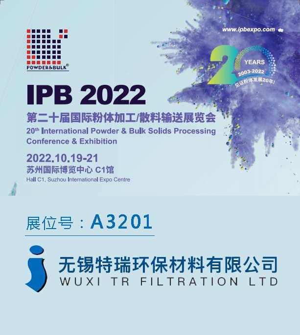 IPB2022第二十届国际粉体加工散料输送展览会,将于10月19日-21日在江苏苏州举办。无锡特瑞环保材料有限公司期待与您金秋十月相约美丽苏州!
